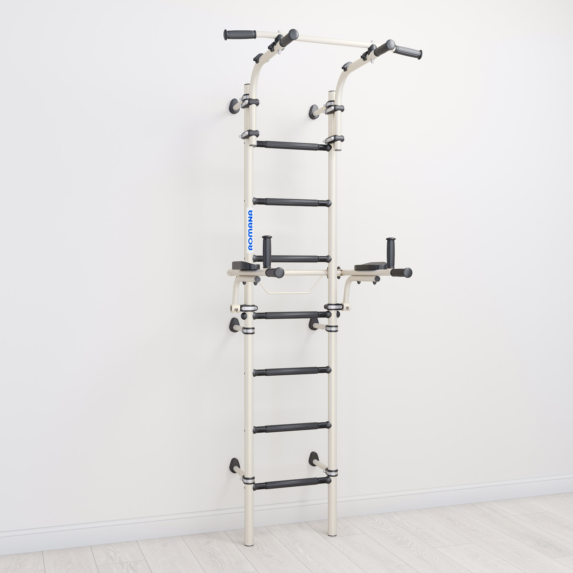 ROMANA С10 — домашний спортивный комплекс для всей семьи, на нем могут заниматься и дети, и взрослые. Он достаточно компактен и не занимает много места: ширина ступеней составляет 410 мм, это самый оптимальный размер для занятий на брусьях, которые идут в комплекте. Брусья откидные, и после занятий их можно перевести в вертикальное положение. Турник можно передвигать по высоте, и закрепить как удобно пользователю с помощью надежных современных хомутов. Спортивный комплекс фиксируется к стене, фиксаторы можно передвигать по вертикали, чтобы избежать попадания в проводку или полости.