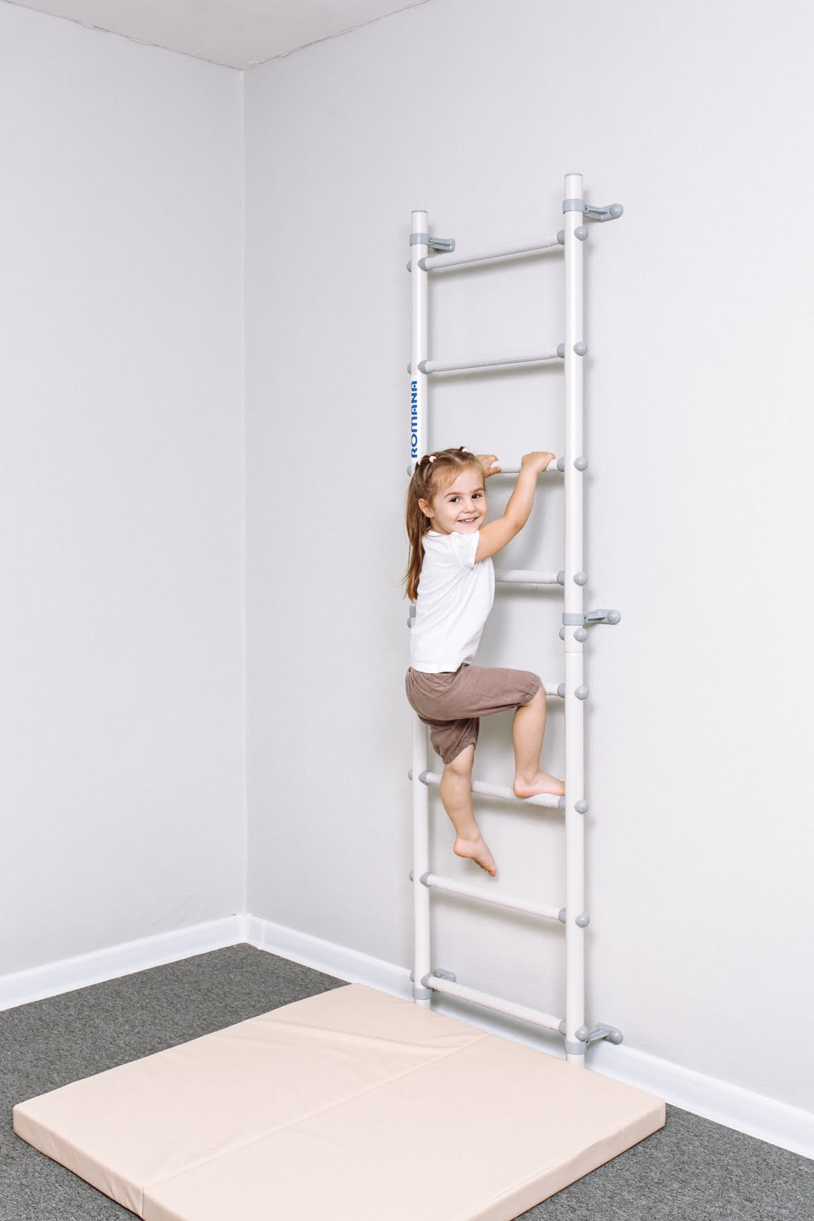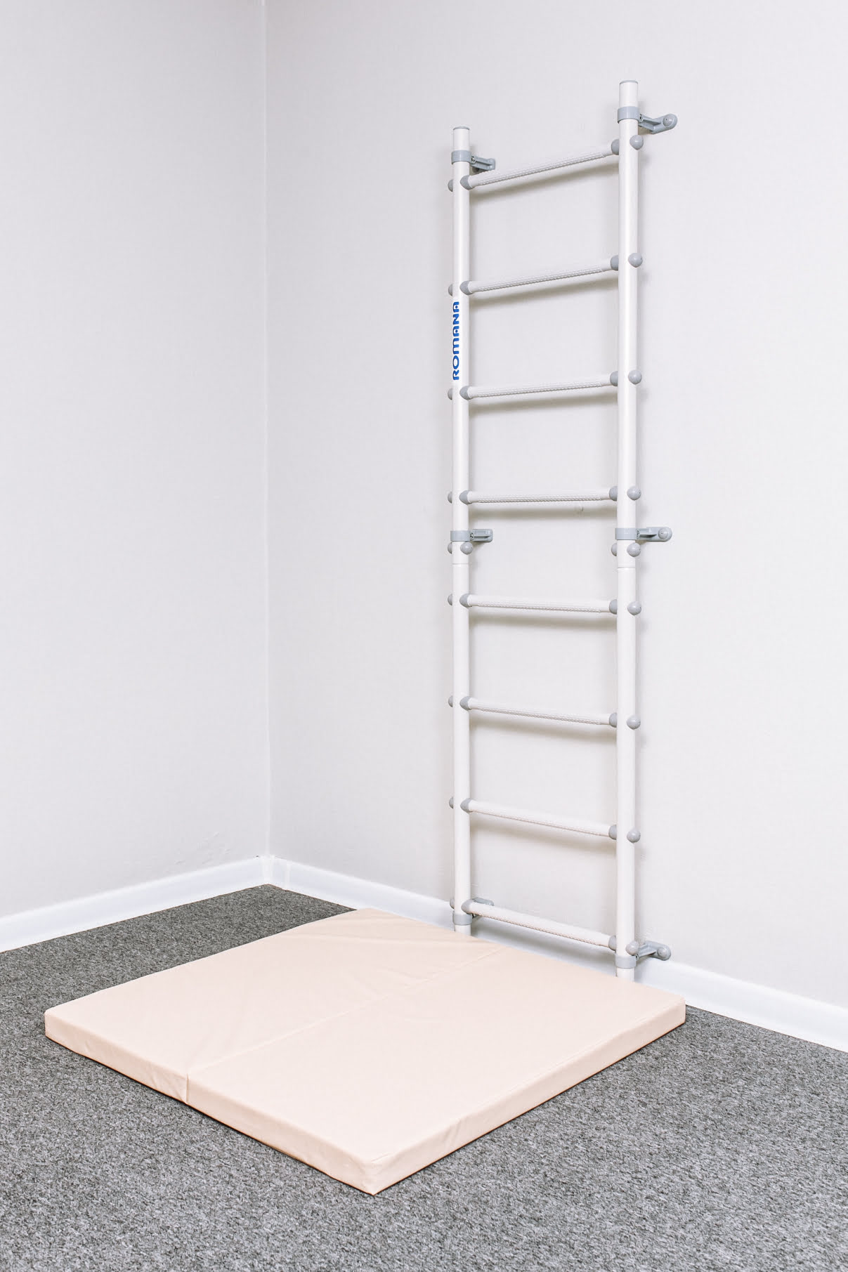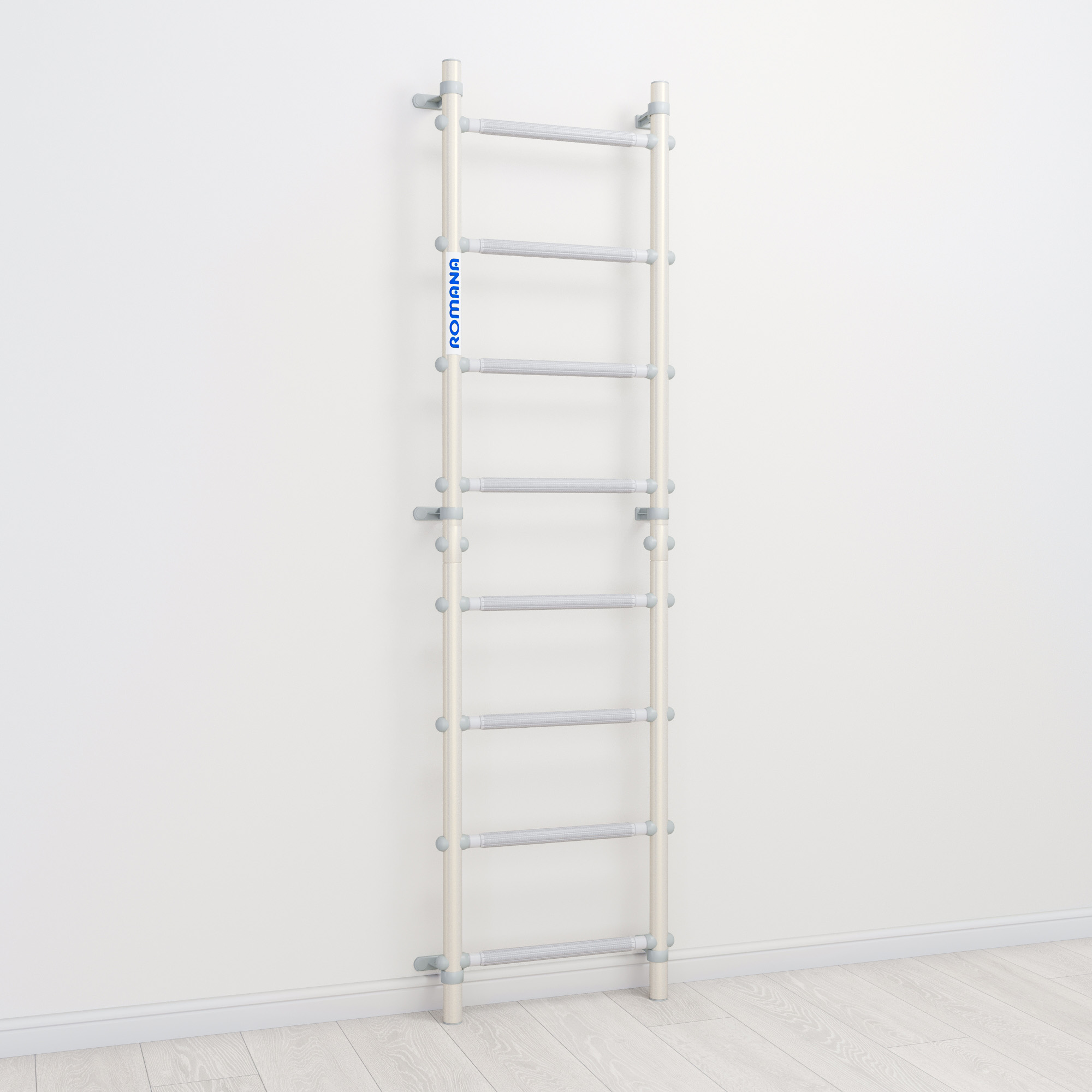 Самое простое и изящное решение для занятий физкультурой дома — шведская стенка ROMANA С11. Это пристенная гимнастическая лестница пастельного белого цвета с серыми массажными ступенями и аккуратными пристенными крепежами, регулируемыми по высоте. Такая крепежная система позволяет избежать попадания в проводку или полости в стене.