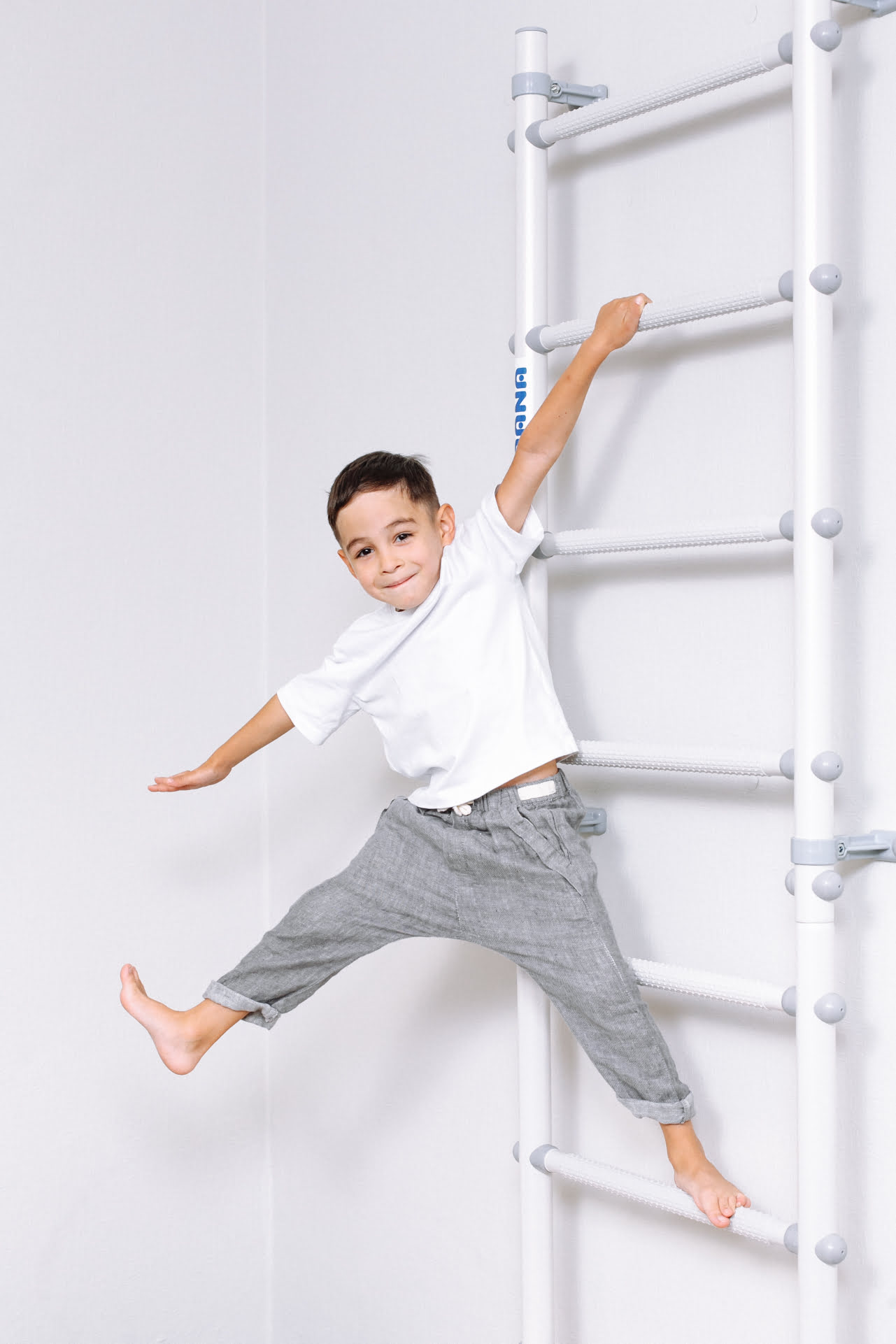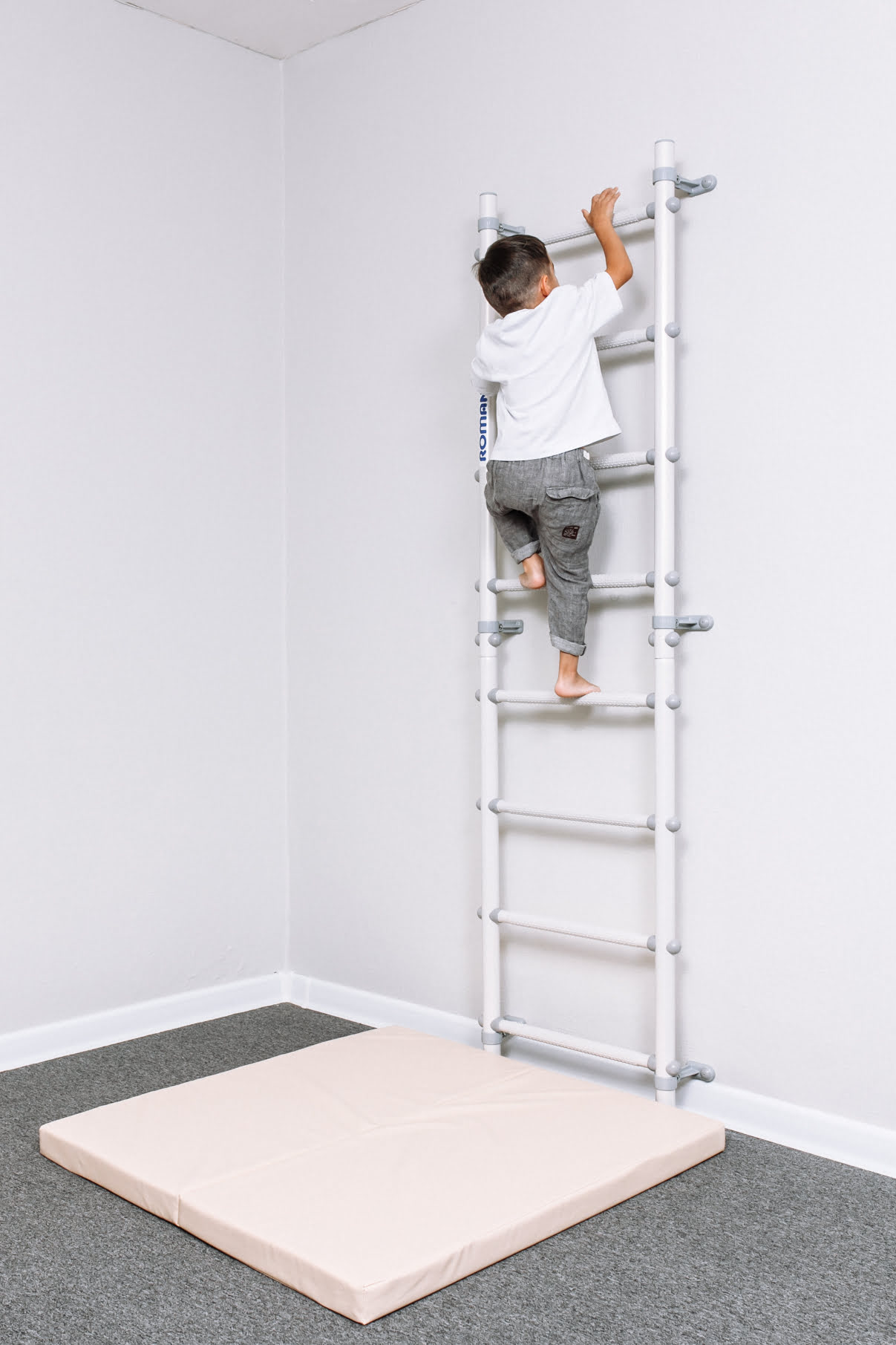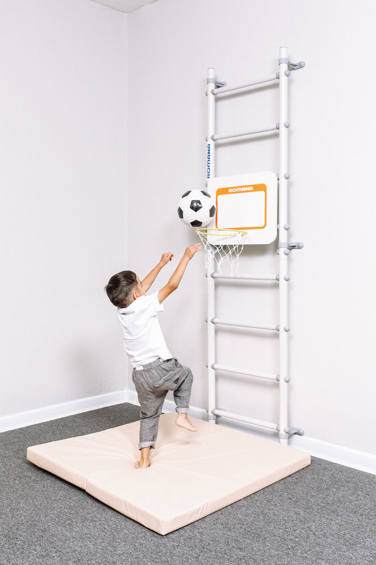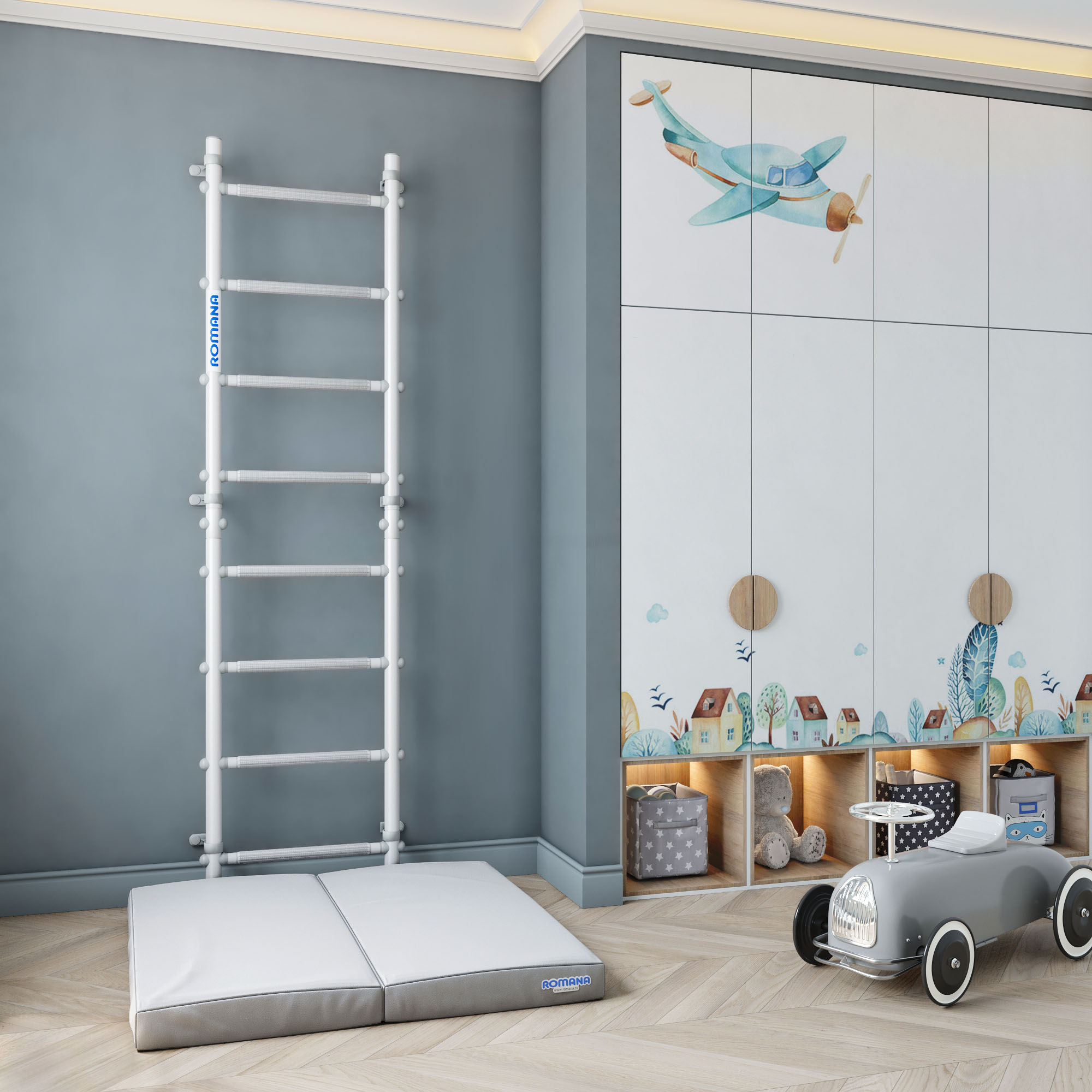 Самое простое и изящное решение для занятий физкультурой дома — шведская стенка ROMANA С11. Это пристенная гимнастическая лестница пастельного белого цвета с серыми массажными ступенями и аккуратными пристенными крепежами, регулируемыми по высоте. Такая крепежная система позволяет избежать попадания в проводку или полости в стене.