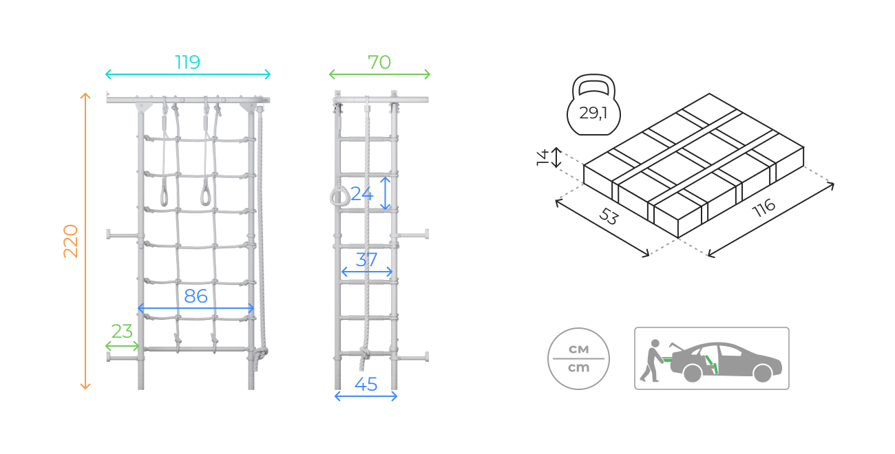 У детского спортивного комплекса ROMANA С4 оригинальная конструкция и расположение элементов. На рукоходе можно разместить разнообразное навесное оборудование. В комплекте предусмотрены канат, кольца и канатный лаз шириной 70 см из крепкого шнура. Конструкция выдерживает вес до 100 кг (нагрузка при испытаниях — 200 кг). Ступени лестницы обладают массажным эффектом, развивая мелкую моторику.