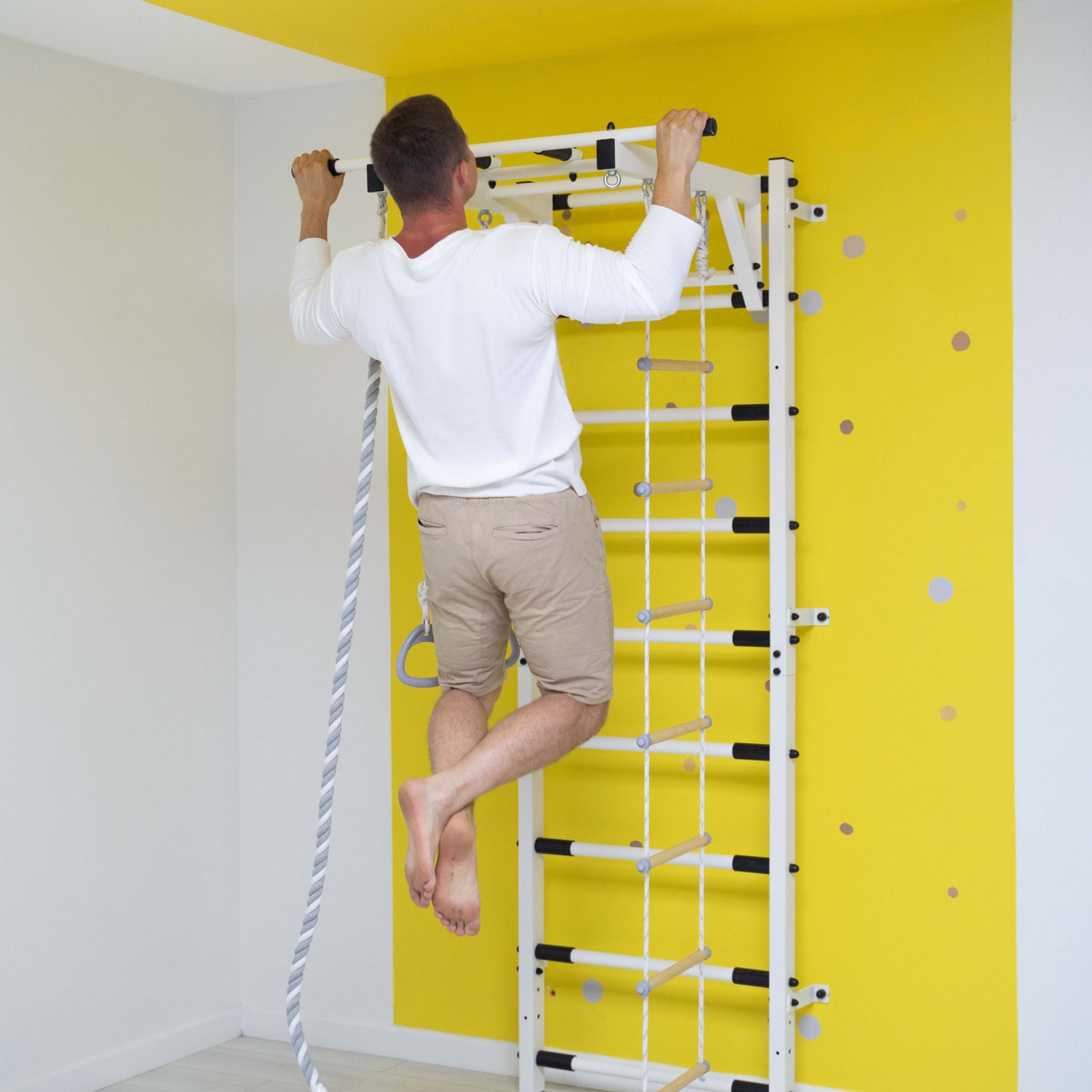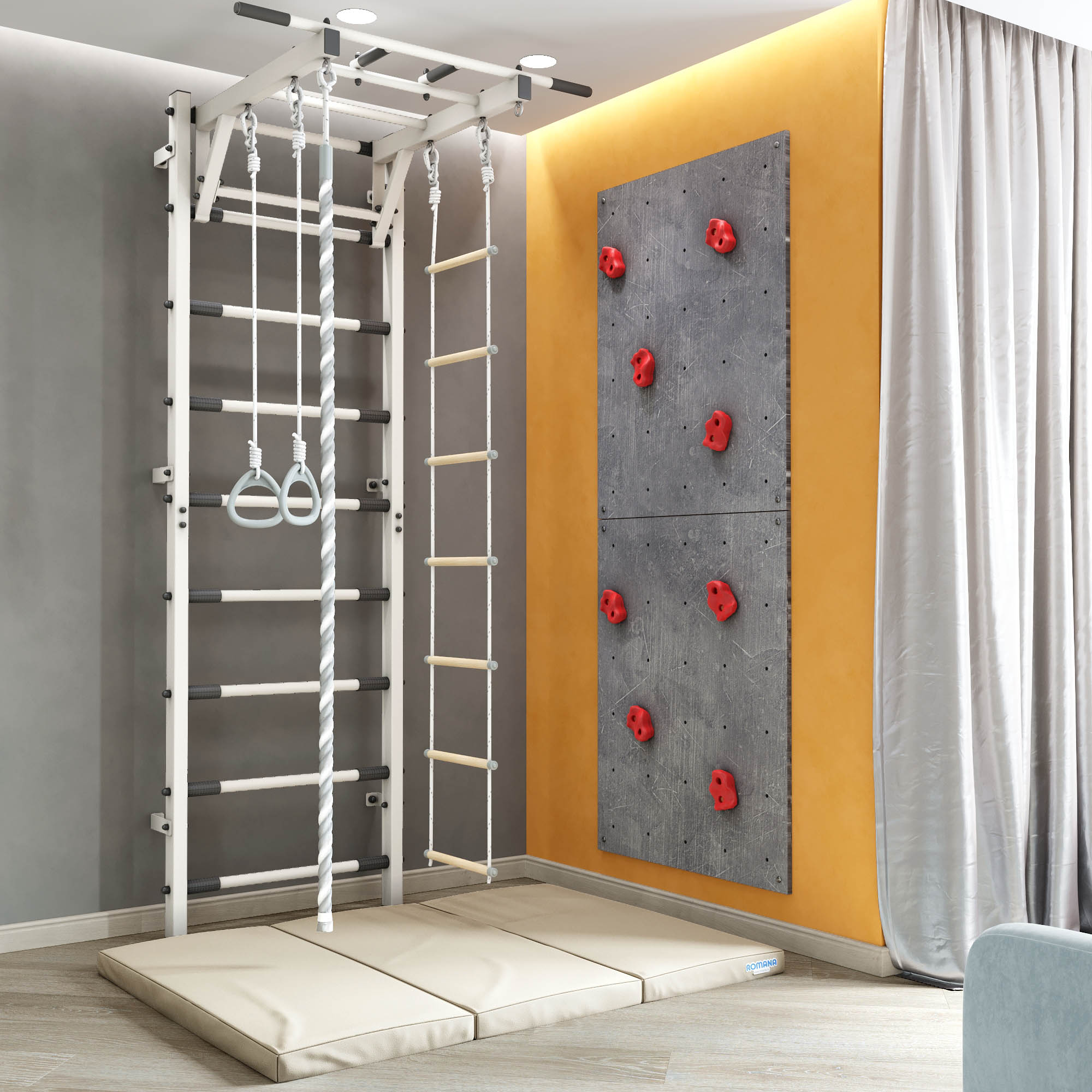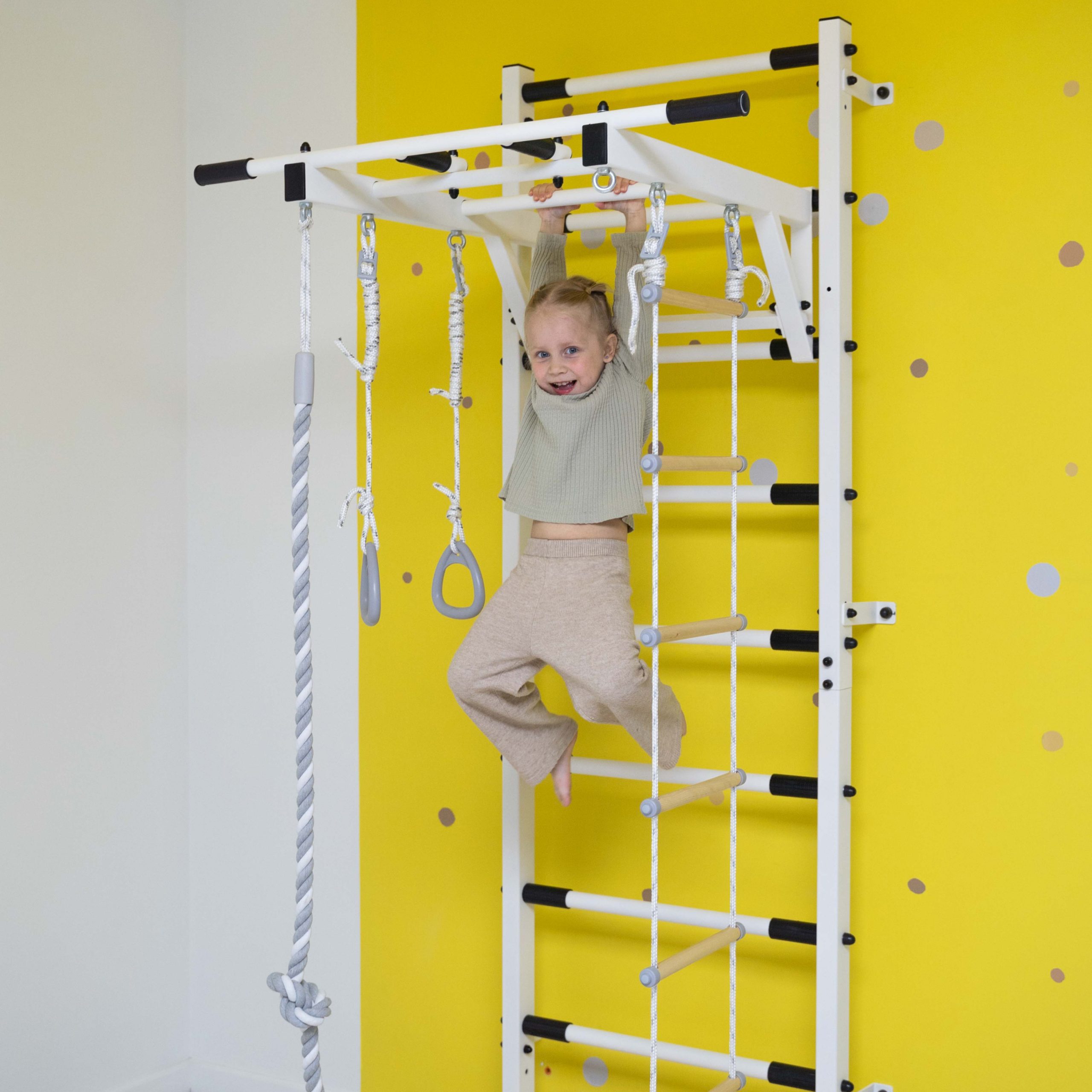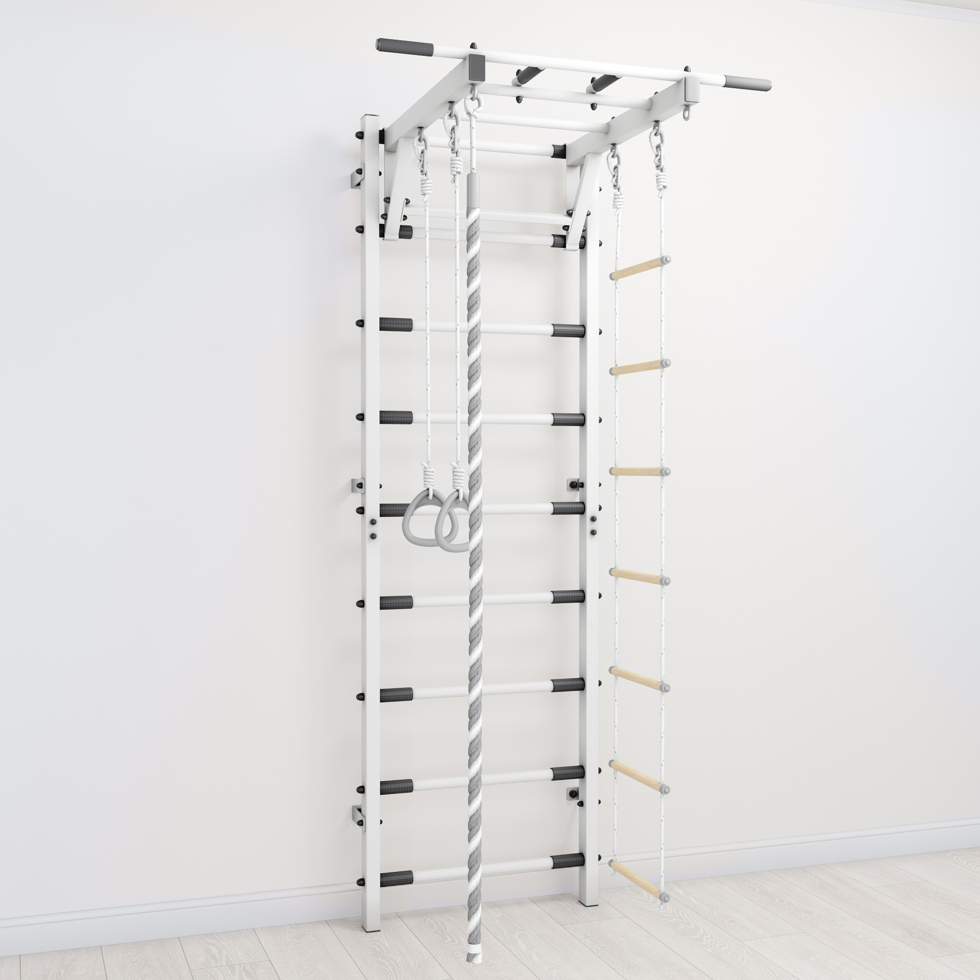 Комплекс изготовлен из экологичных и гипоаллергенных материалов, легко моется при помощи влажной безворсовой ткани. Все элементы покрыты премиальной краской с эффектом шероховатости, фактурное покрытие которой приятное, бархатистое на ощупь и придает изделию еще более стильный вид. Благодаря лаконичному дизайну домашний комплекс впишется в любой интерьер. Легко собирается и монтируется. Для более безопасных тренировок не забудьте приобрести мягкий защитный мат.