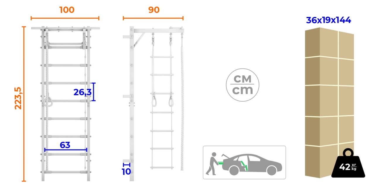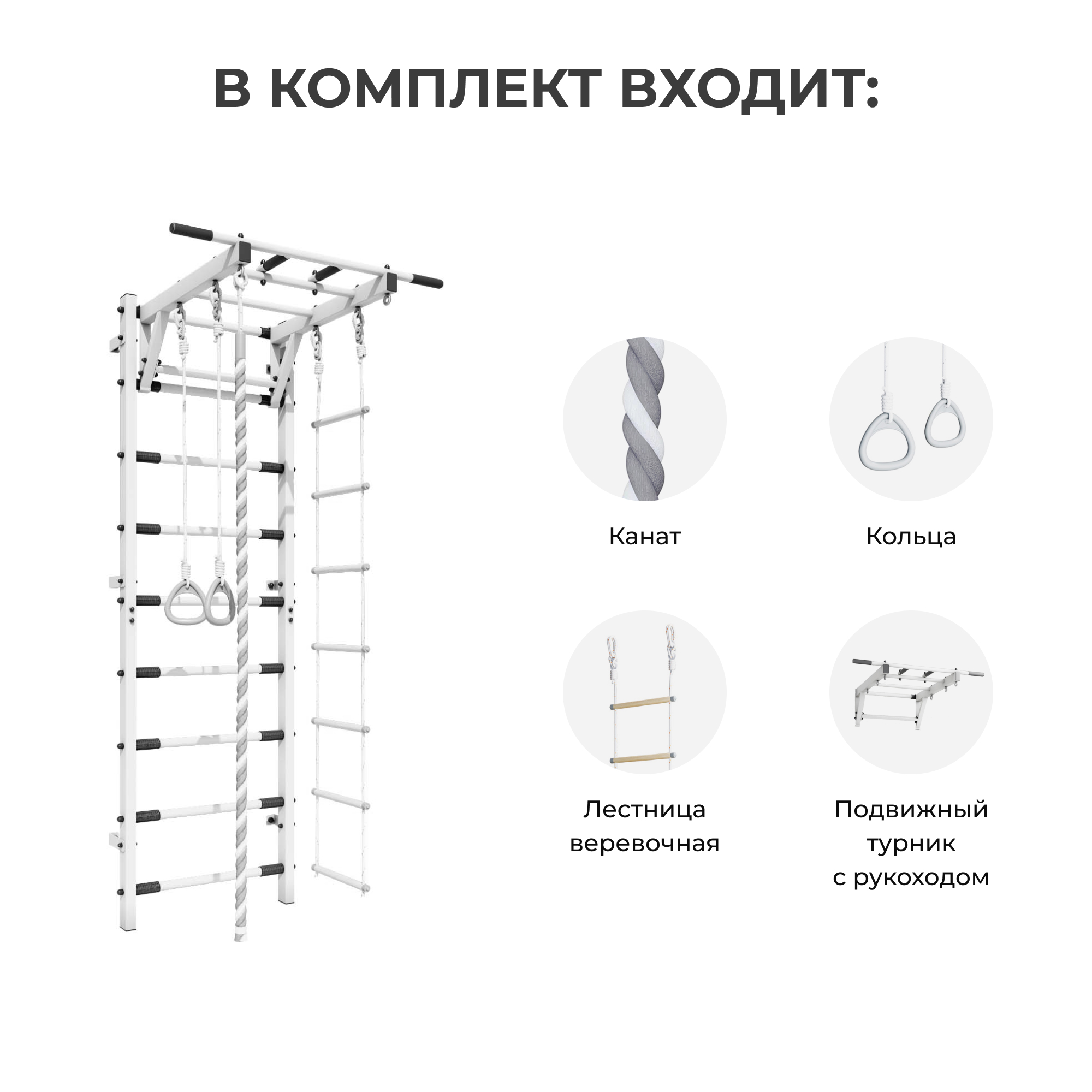 Комплекс состоит из шведской стенки, съемного турника, который можно легко и без использования инструмента переставить на нужную высоту . Турник 3в1 для домашних тренировок позволяет менять хват и выполнять различные физические упражнения для всех групп мышц. Резиновые накладки по бокам ступеней защищают покрытие от истирания во время регулировки высоты турника.