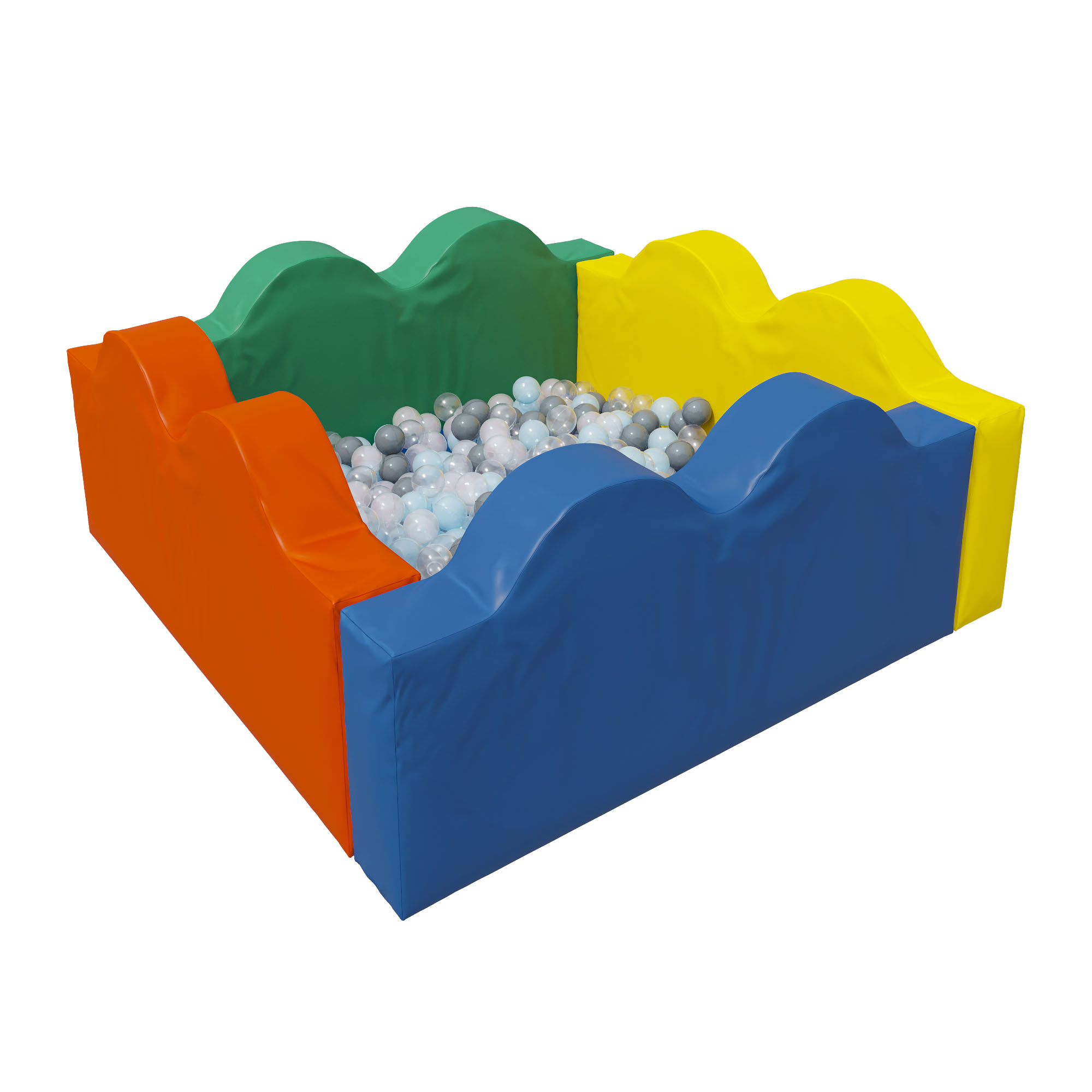 Сухой бассейн с шариками «Волна» — необычный бассейн с волнистыми бортами для детской комнаты или дачного участка. Сухой бассейн собирается из отдельных элементов, которые крепятся друг к другу с помощью липучек. Мягкие бортики в форме волн и такой же мягкий мат, выполняющий роль дна, обеспечивают малышу полный комфорт и безопасность во время игры. Дно и стенки бассейна, изготовлены из поролона и обтянуты качественной износостойкой винилискожей. Вместо воды такой резервуар заполняется пластмассовыми шариками (входят в комплектацию 300 шариков), «плавая» в которых дети развивают координацию движений, мелкую моторику и получают полезный расслабляющий массаж всего тела. Помогает малышу развивать мелкую моторику, знакомиться с цветами и объёмами предметов. Габаритные размеры 1400 х 1400 x 400 мм. Отлично моется. Вес с упаковкой 12,5 кг.