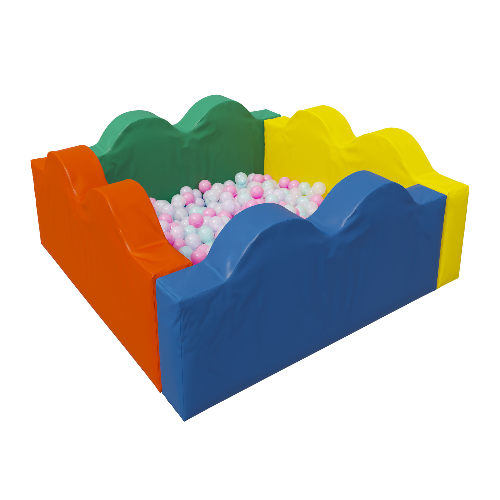 Сухой бассейн с шариками «Волна» — необычный бассейн с волнистыми бортами для детской комнаты или дачного участка. Сухой бассейн собирается из отдельных элементов, которые крепятся друг к другу с помощью липучек. Мягкие бортики в форме волн и такой же мягкий мат, выполняющий роль дна, обеспечивают малышу полный комфорт и безопасность во время игры. Дно и стенки бассейна, изготовлены из поролона и обтянуты качественной износостойкой винилискожей. Вместо воды такой резервуар заполняется пластмассовыми шариками (входят в комплектацию 300 шариков), «плавая» в которых дети развивают координацию движений, мелкую моторику и получают полезный расслабляющий массаж всего тела. Помогает малышу развивать мелкую моторику, знакомиться с цветами и объёмами предметов. Габаритные размеры 1400 х 1400 x 400 мм. Отлично моется. Вес с упаковкой 12,5 кг.
