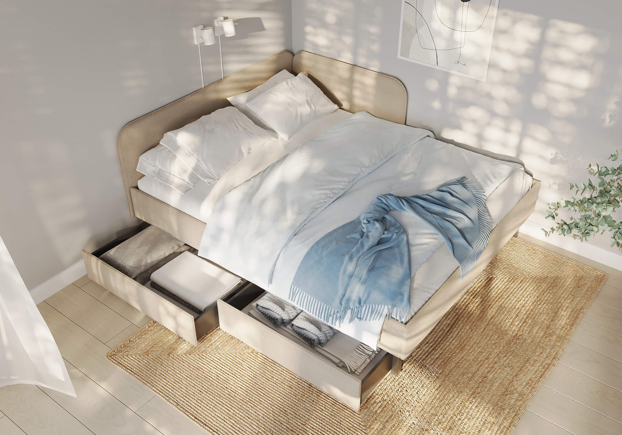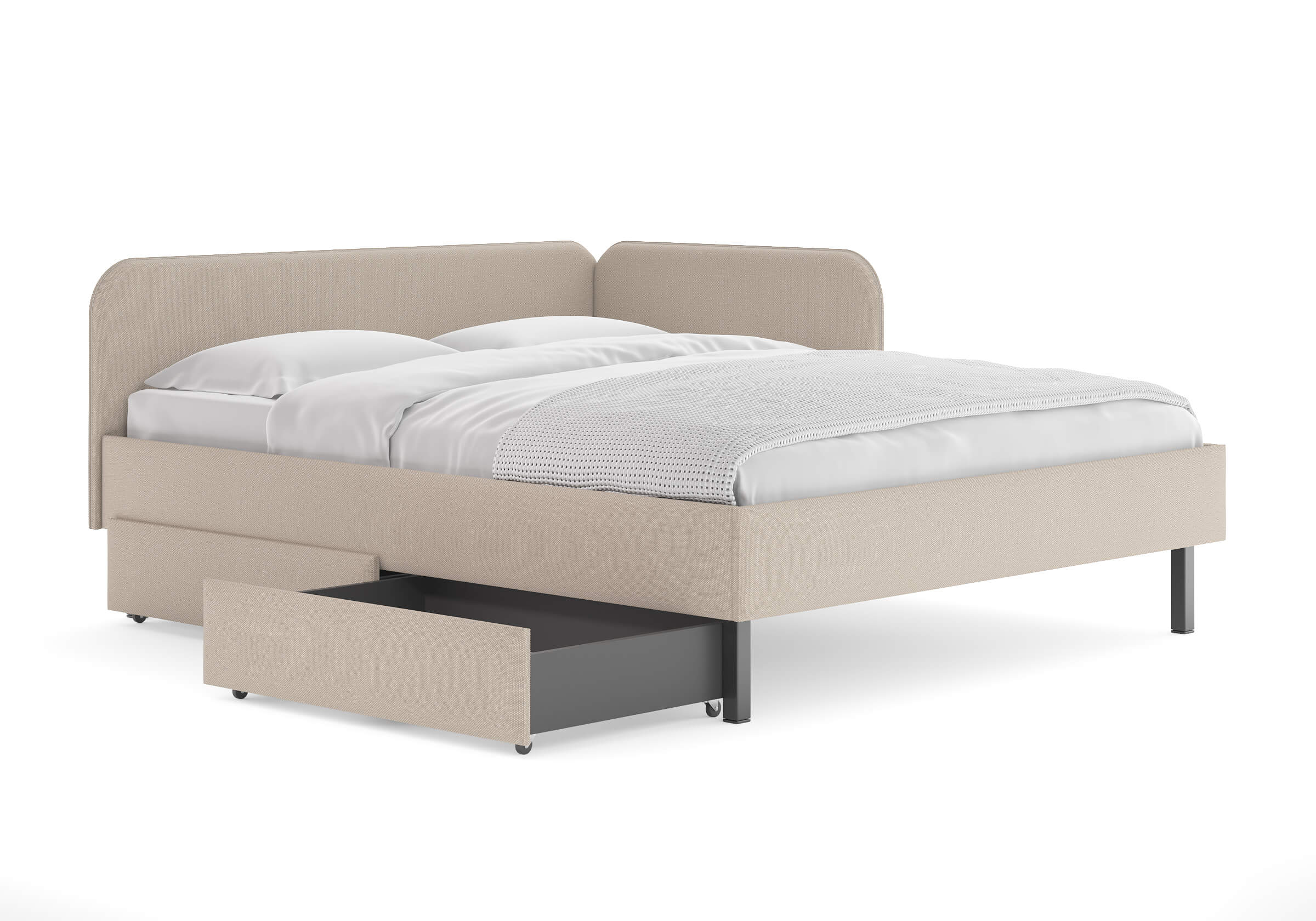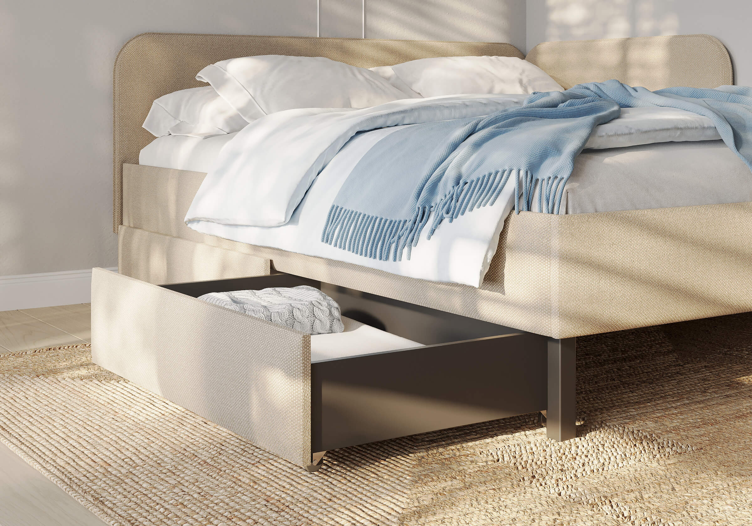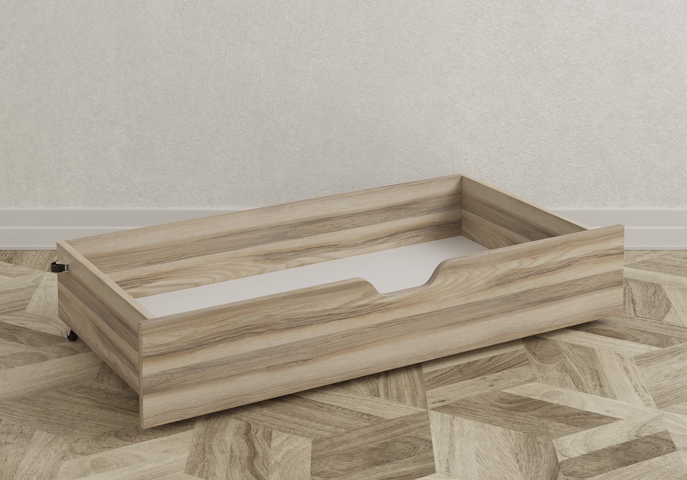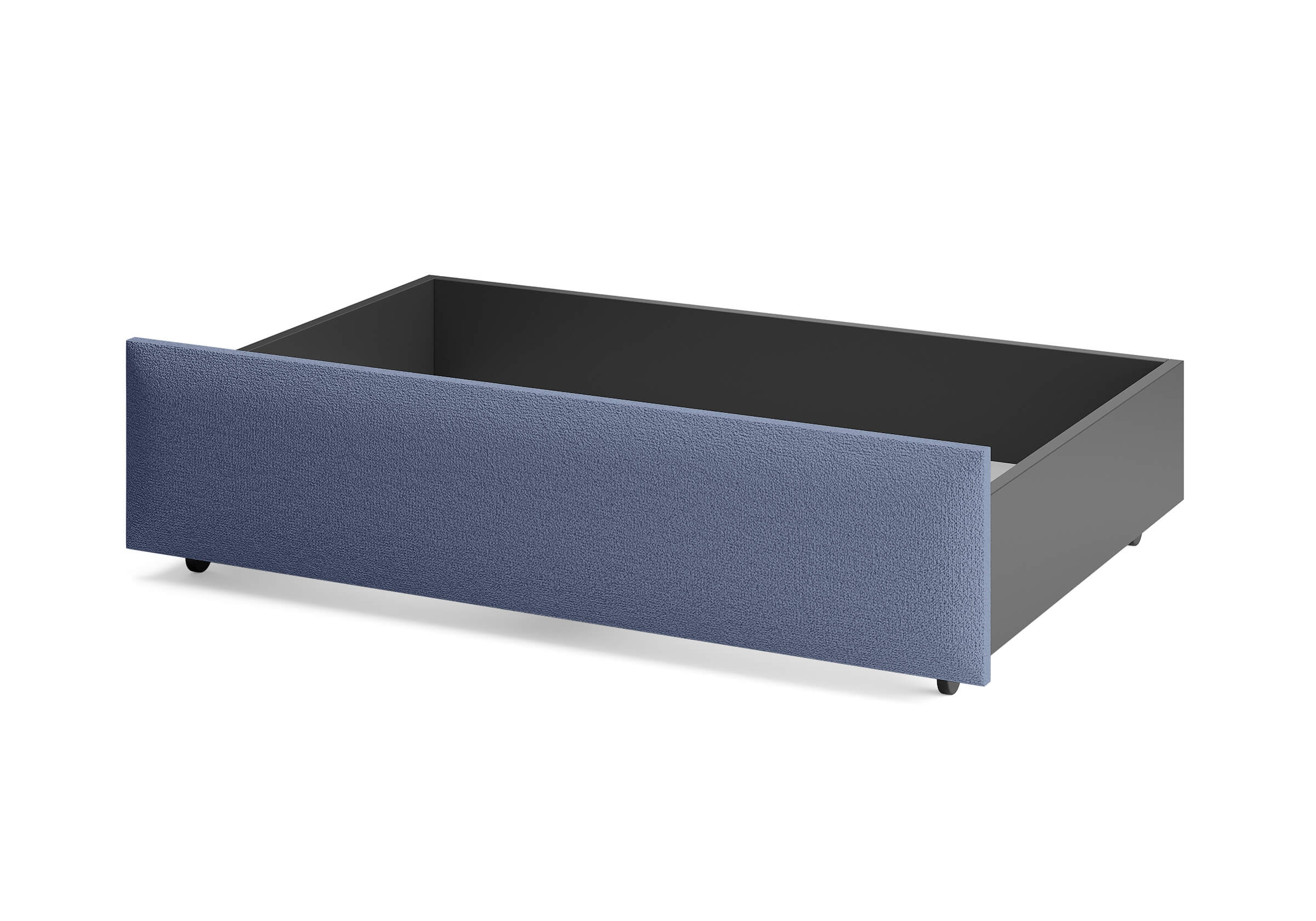 Ящик для хранения в ткани — лаконичное и функциональное решение для интерьера в современном, скандинавском и стиле минимализм. Ящики c мягкой обивкой фасада идеально сочетаются с кроватями Hanna и Julia, являются их функциональным дополнением — местом хранения. Ящики позволяют задействовать пространство под кроватью, не загромождая спальню. Они мобильны, их легко выкатывать и задвигать, что удобно для быстрого доступа к вещам, а также легкой уборки под кроватью. Фасад ящика мягкий, выполнен в тканевой обивке. Материал исполнения такой же как у кроватей Hanna, Julia — практичная рогожка багама. Корпус – ЛДСП графит. Надежные, поворотные колесные опоры с радиусом поворота 360 градусов.